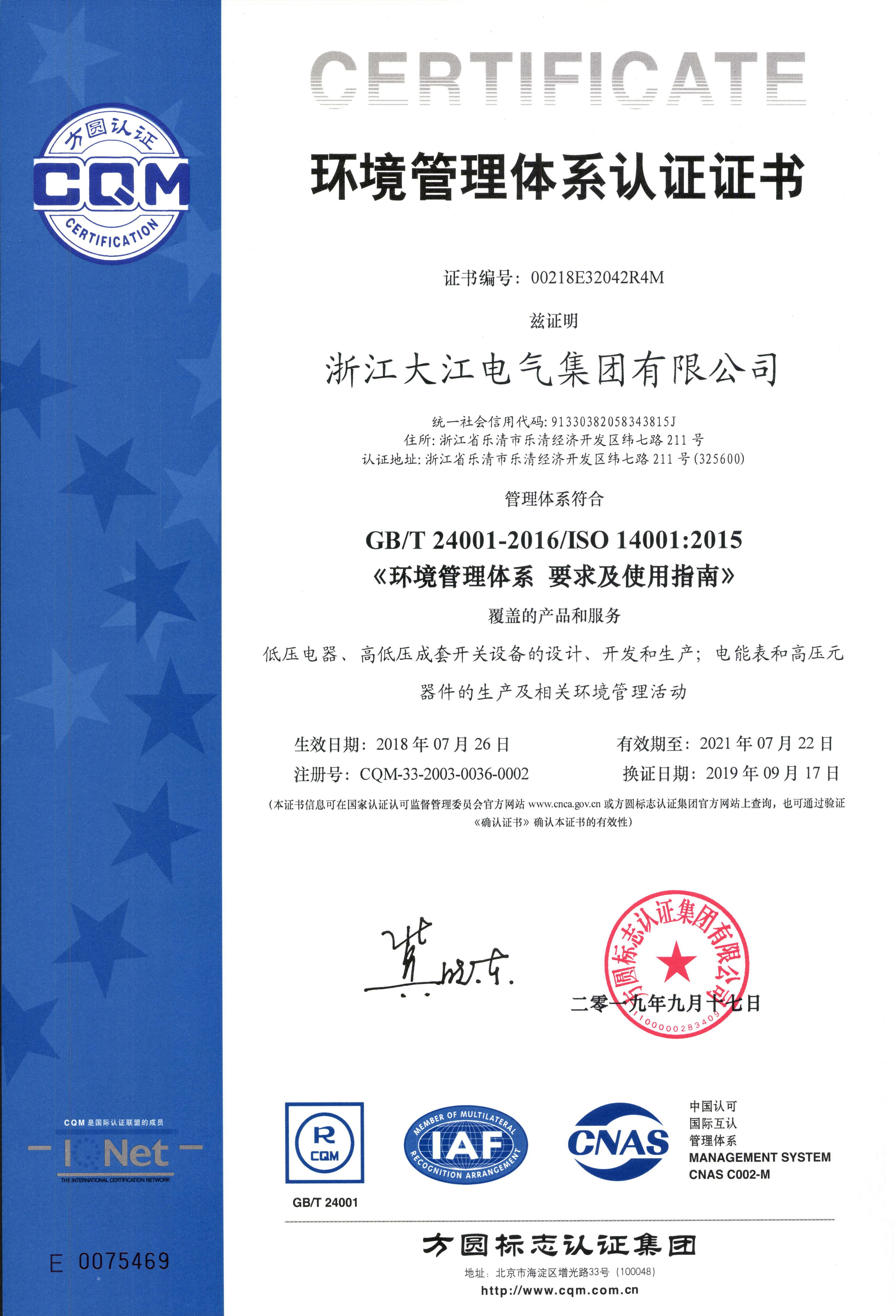 環(huán)境管理體系認(rèn)證證書
