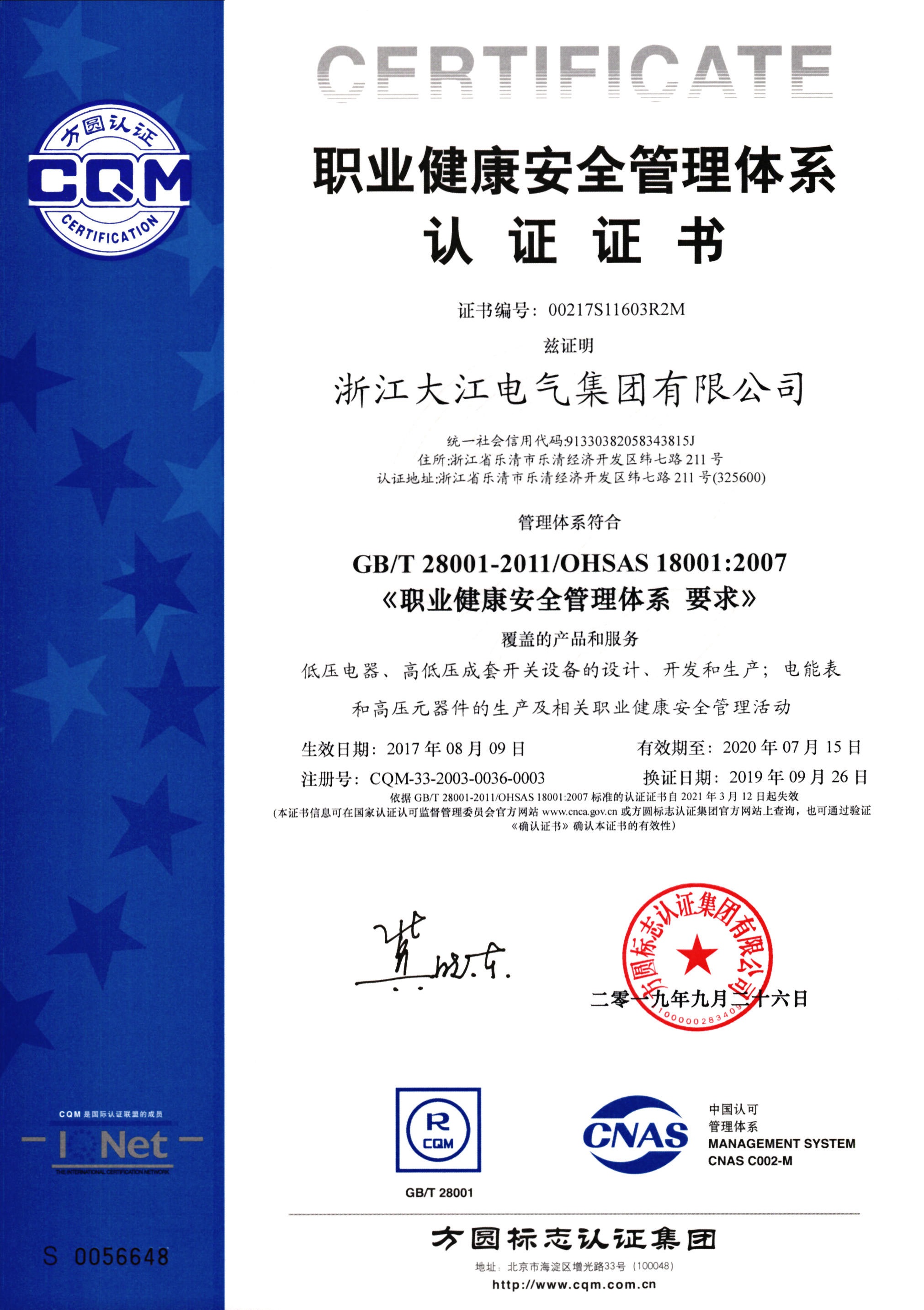 質(zhì)量管理體系認(rèn)證證書